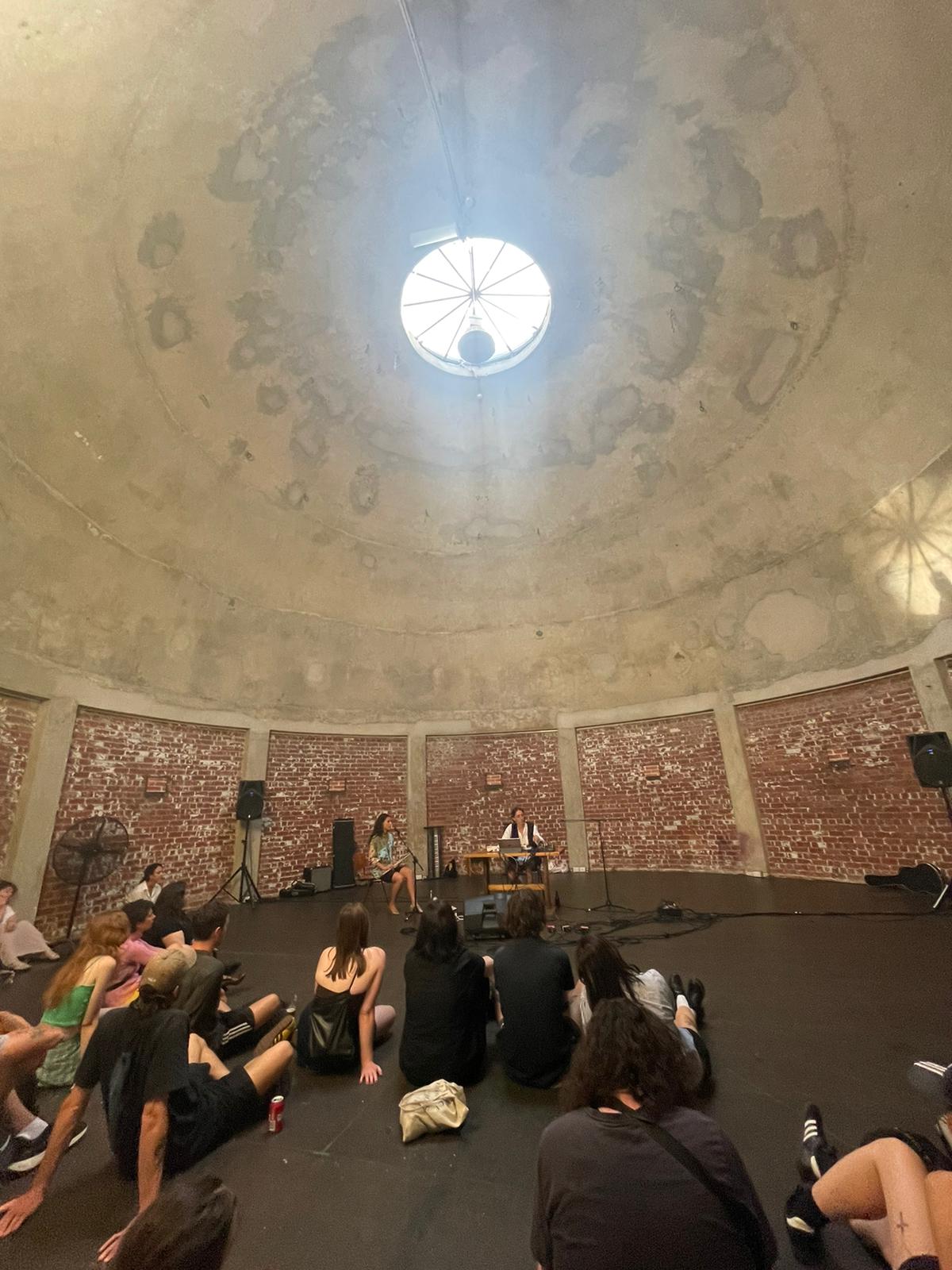 Traditional instruments becoming digitally manipulated becoming physically resonant inside concave walls.